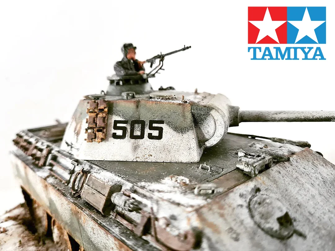 Es gibt unzählige Fertigmodelle und Modellbausätze (sogenannte Model-Kits) aus Holz und Kunststoff. Hier gilt: je mehr man an Geschicklichkeit beim Bauen und Lackieren beweisen muss, desto besser. Ich habe im Laufe der Jahre besonders Revell Bausätze zu schätzen und lieben gelernt. Ebenso hoch stand bei mir stets die Auswahl von Italeri und Tamiya. Hat man das Modell wie gewünscht gebaut und vorbereitet, versiegelt man es als Standmodell auf eine glatte Fläche. In diesem Fall am Beispiel des mittleren Panthers mit Seitenschürzen von Tamiya aus dem Spätwinter 44 in Frankreich, das später als Titelbild eines Buches über die Panther-Serien zieren sollte, 350g starke Pappe. Da man direkt und feucht auf den Untergrund der Platte arbeitet, wellt sie sich natürlicherweise. So muss man die Platte im Bau- sowie Trocknungsprozess noch vor anbringen auf das Buch strecken bzw. spannen, damit es sich nicht (zu stark) wellt.