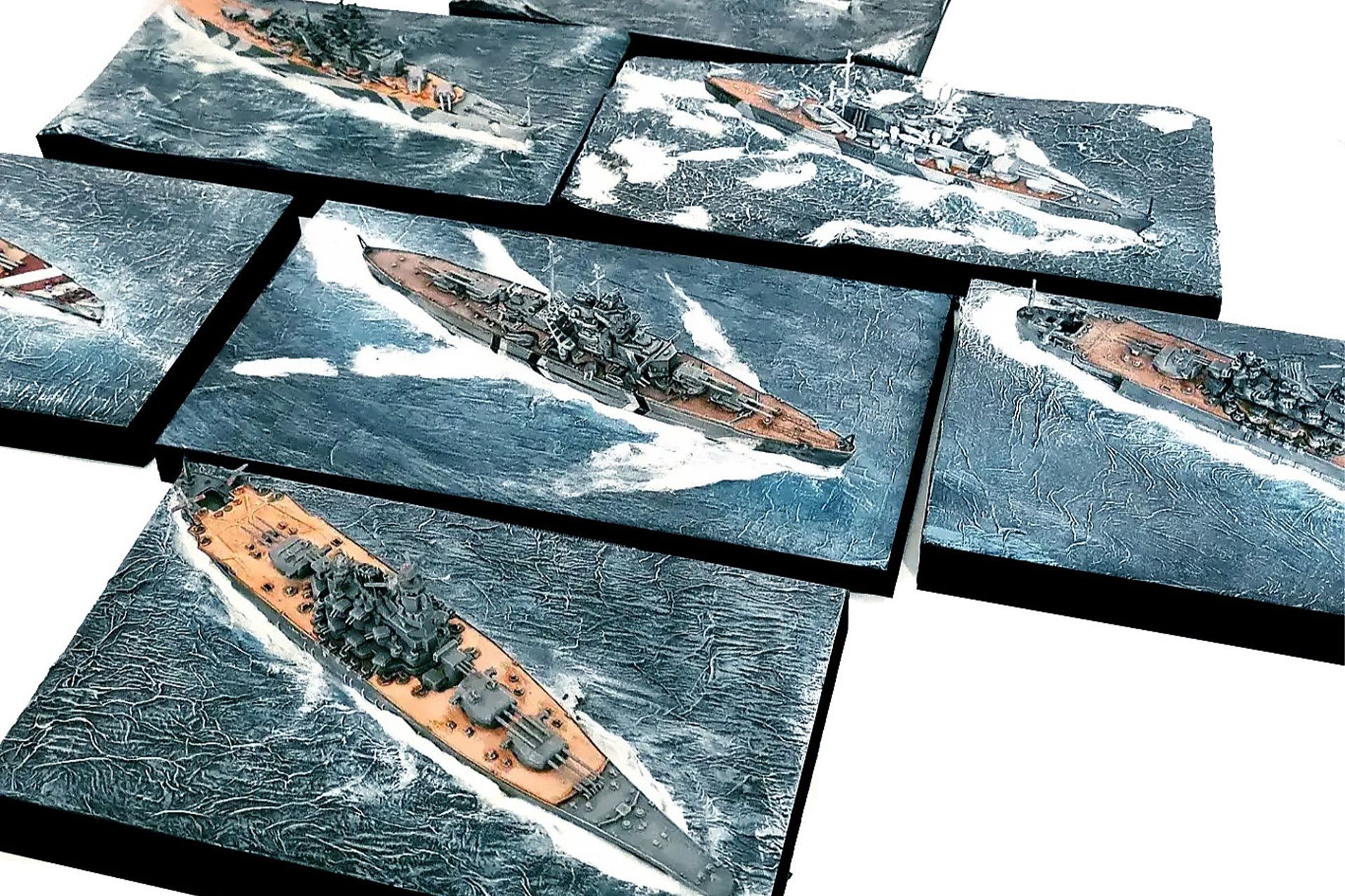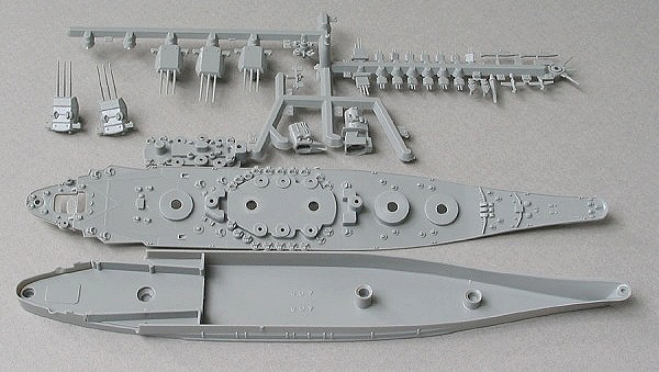 Über den Bau der Modellbausätze zu berichten, halte ich an dieser Stelle für übertrieben. Es sind überschaubar viele Teile, manche braucht man nicht mal zu kleben. Geschütztürme sind beweglich – Türme seitlich, Rohre auf- und abwärts. Ich empfehle vor dem Zusammenbau die Spritzlinge für eine Viertelstunde in ein Wasserbad mit etwas Spülmittel zu legen, damit sie fettfrei werden und dadurch später leichter und besser verarbeitet werden können. Zudem empfehle ich alle Teile mit einer hellgrauen Grundierung zu überziehen (Haftgrund). Das spätere Finallackieren wird dadurch kräftiger und die Farben haben einen besseren Halt.