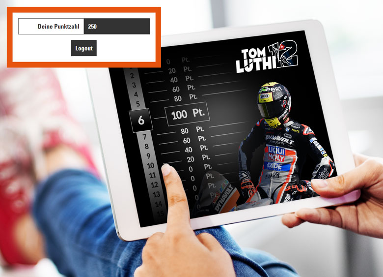 Um gewinnen zu können, musst du Tipps zu den Platzierungen der einzelnen Rennen von Tom Lüthi abgeben. Die Höchstpunktzahl erreichst du, wenn du genau richtig getippt hast. Je weiter du mit deinem Tipp vom Ergebnis nach oben oder unten entfernt bist, desto weniger Punkte erhälst du (+/-20 Punkte). Es wird ein internes Ranking geführt. Die Teilnehmer mit den 5 besten Punktzahlen, erhalten einen entsprechenden Preis.