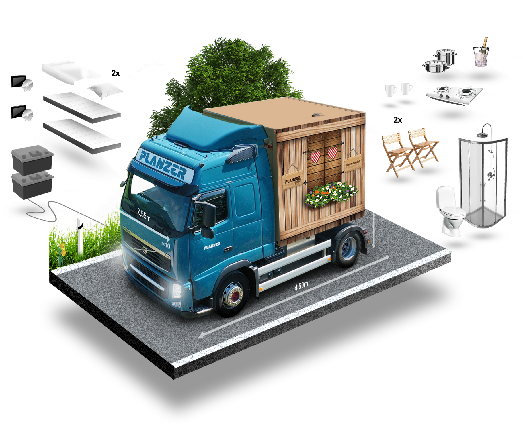 Manche Menschen träumen davon, am Abend vor einer imposanten Kulisse zu Bett zu gehen oder am Morgen in einem speziellen Ambiente zu frühstücken, zum Beispiel vor dem Alpenpanorama, am See oder City downtown. Unser Planzer Motel ist da, wo besondere Träume sind. Auf knapp 10 m2 startet die Freiheit des Truckerlebens – und der Anfang jeder guten Geschichte. Zum Beispiel derjenigen von Curdin Orlik, der sich fürs nächste Schwingen vorbereitet. Oder von Nicole und Sascha, die den Sturm ihrer Beziehungen durch den Alltag fegen lassen. Oder von Klein-Lionel, dem wir gemeinsam mit der Kinderhilfe Sternschnuppe das Sternschnuppenzählen vom Cockpit aus ermöglicht haben.